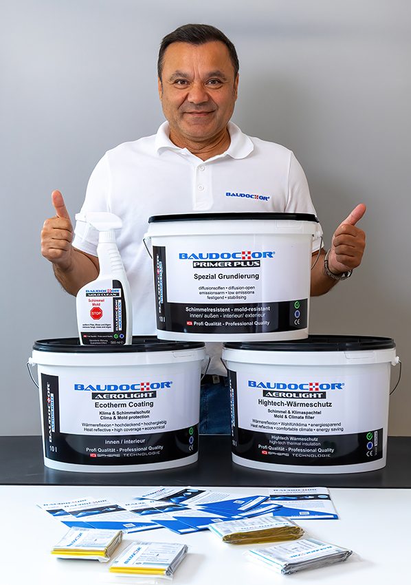 Für unsere Sanierungsprojekte setzen wir neben Markenprodukten auch Produkte unserer eigenen Marke „BAUDOCTOR“ ein. Diese Produktlinie ist das Ergebnis aus 25 Jahren Praxiserfahrung und der Zusammenarbeit mit renommierten Instituten. Die BAUDOCTOR-Produkte vereinen modernste bauphysikalische Erkenntnisse mit hoher Alltagstauglichkeit, sind diffusionsoffen, langlebig und speziell für die Beseitigung von Feuchtigkeit und Schimmel entwickelt.